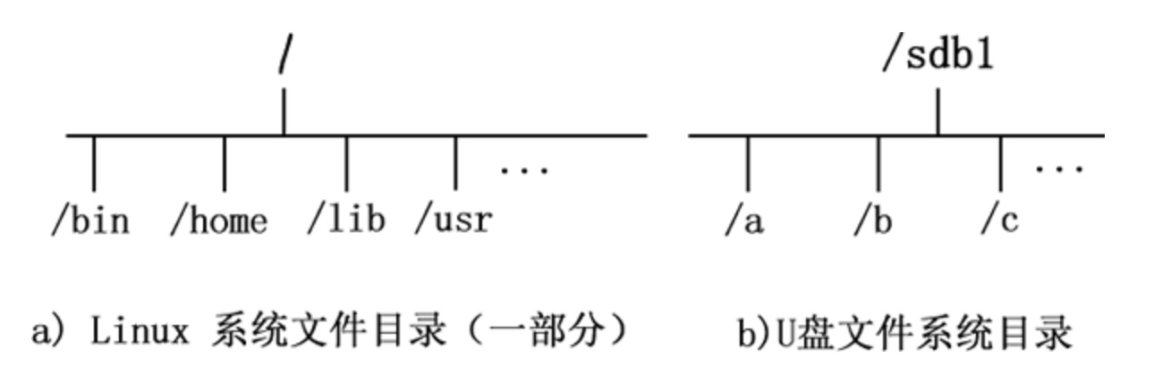 如图所示,是U盘存储设备和Linux系统自己的文件系统结构,此时Linux想要使用U盘的硬件设备,必须将Linux本身的目录和硬件设备的文件目录合二为一,此过程就称之为挂载。