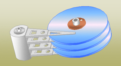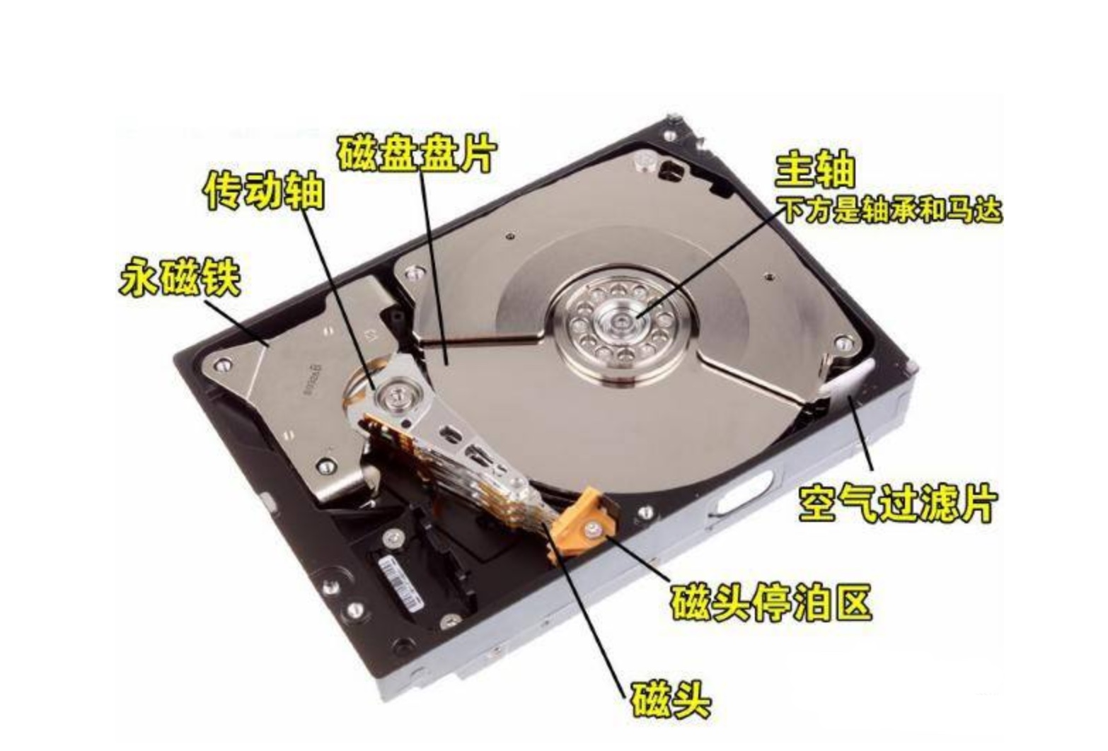 常见的硬盘内部构造如图,由圆形盘片、磁头臂、磁头、主轴马达组成。